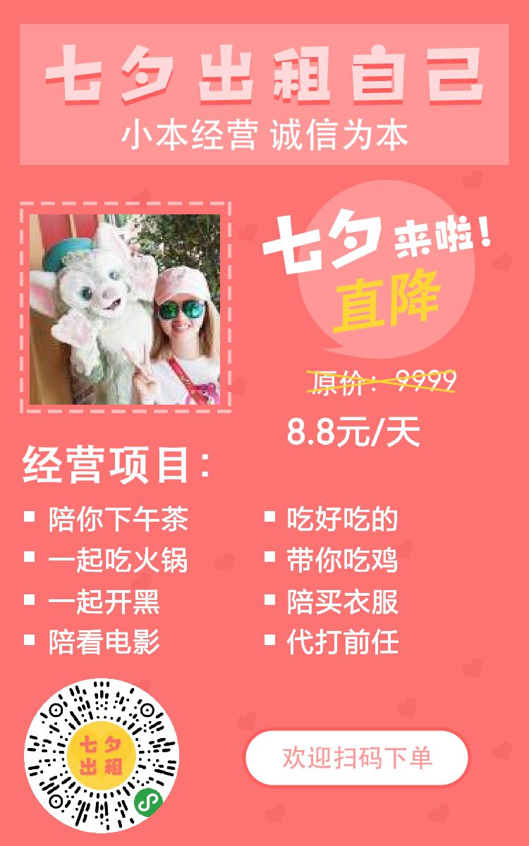 你对“七夕出租自己”怎么看?欢迎在留言区和我们分享你的看法~