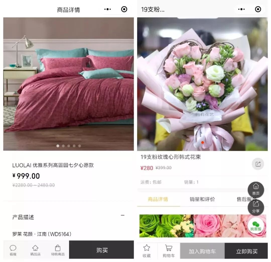 第一种有购买按钮,点击跳转,可直接在小程序中购买商品。罗莱家纺是在其微主页的精品店页面。尚有花艺则跳转到其电商小程序“尚有花艺花店”。