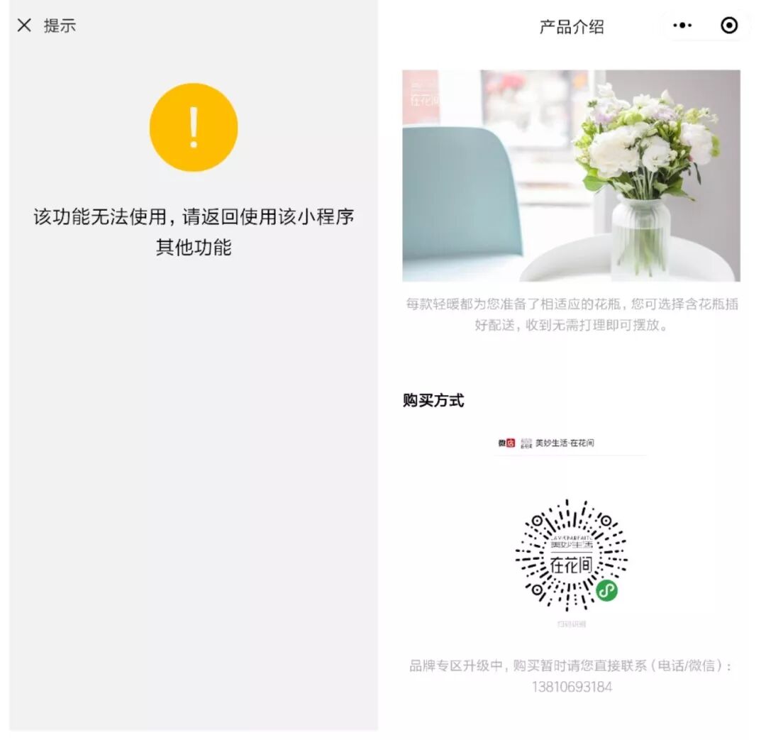 不过,微订花的购买按钮点击后显示“该功能无法使用,请返回使用该小程序其他功能”。而美妙生活在花间显示“品牌专区升级中,购买暂时请您联系(电话/微信)”。我们猜测,可能该功能仍在调试中。