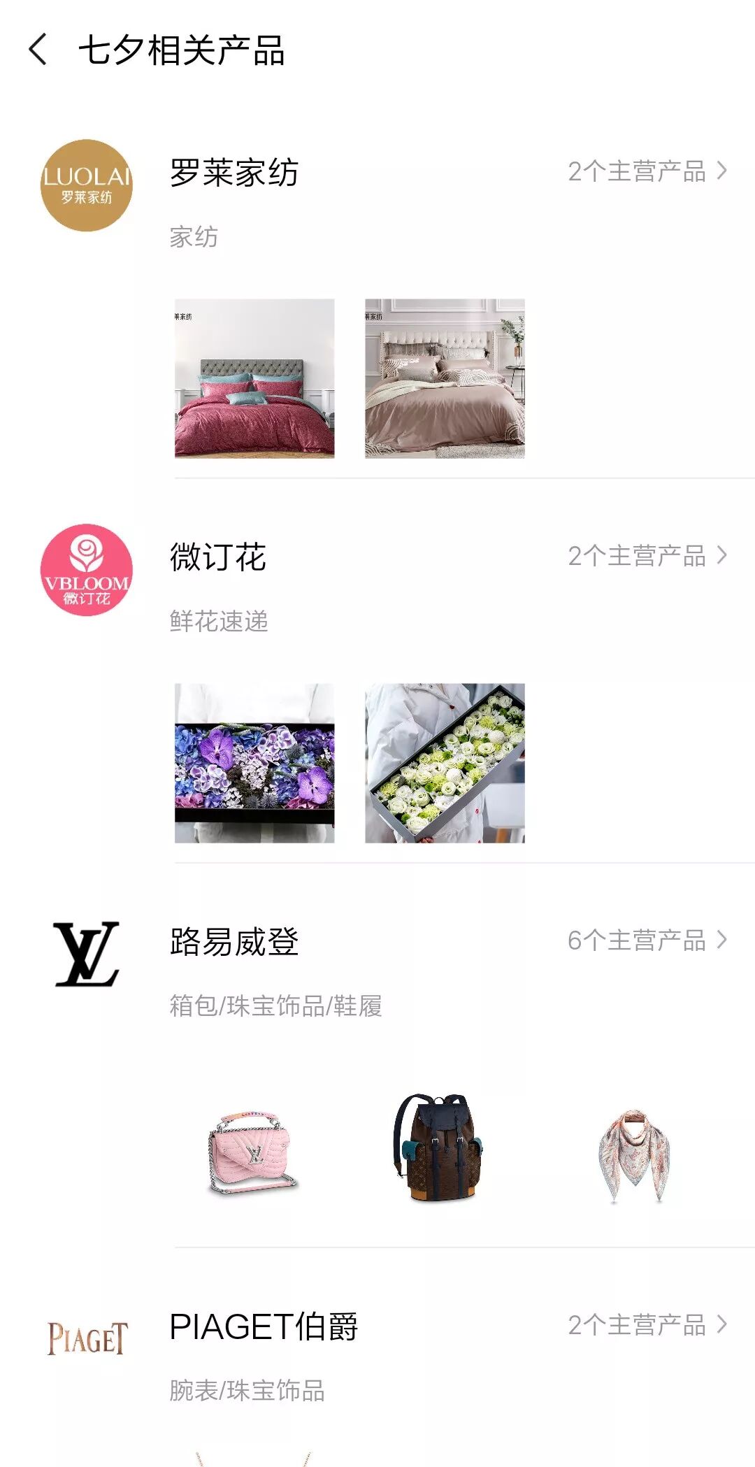 因此,在七夕当天,微信为了对相关品牌和产品进行流量扶持,推出新功能产品聚合页并不令人意外。