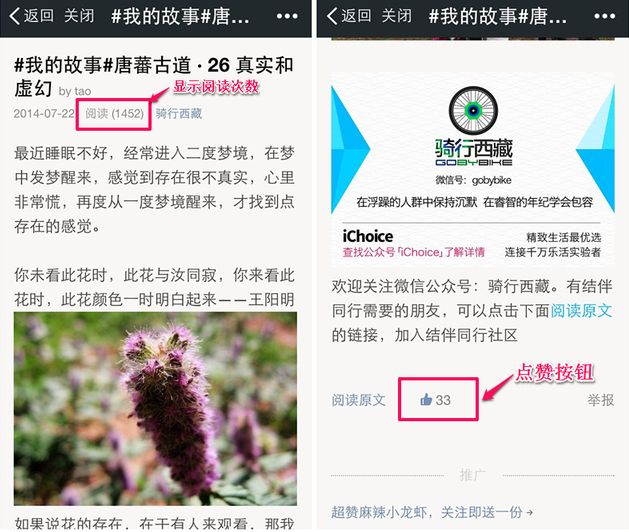 7月23日深夜,打开“骑行西藏”推送的文章,公号名字旁边赫然出现了阅读数的显示,文末出现了点赞按钮。