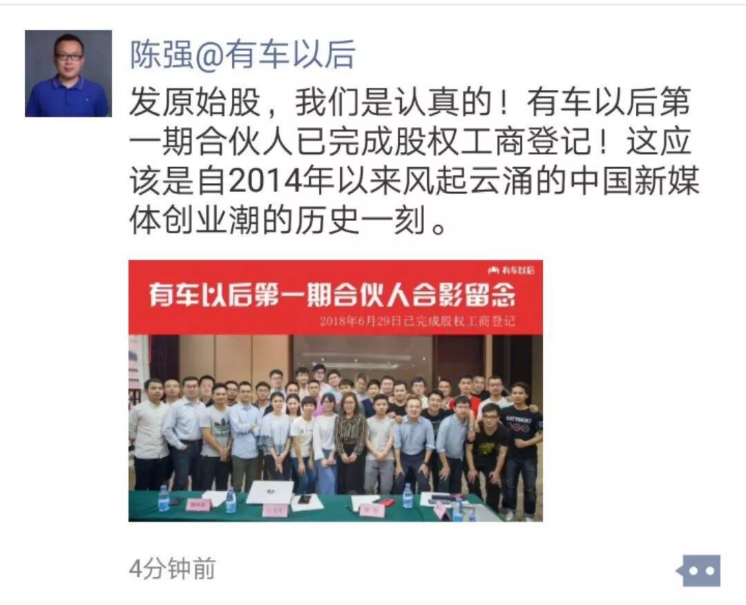 如果说公号改变命运,和那些创业者一样,不久前,有30多位“有车以后”的核心员工,他们正是这样的代表,成为公司首批“股权激励”的对象。