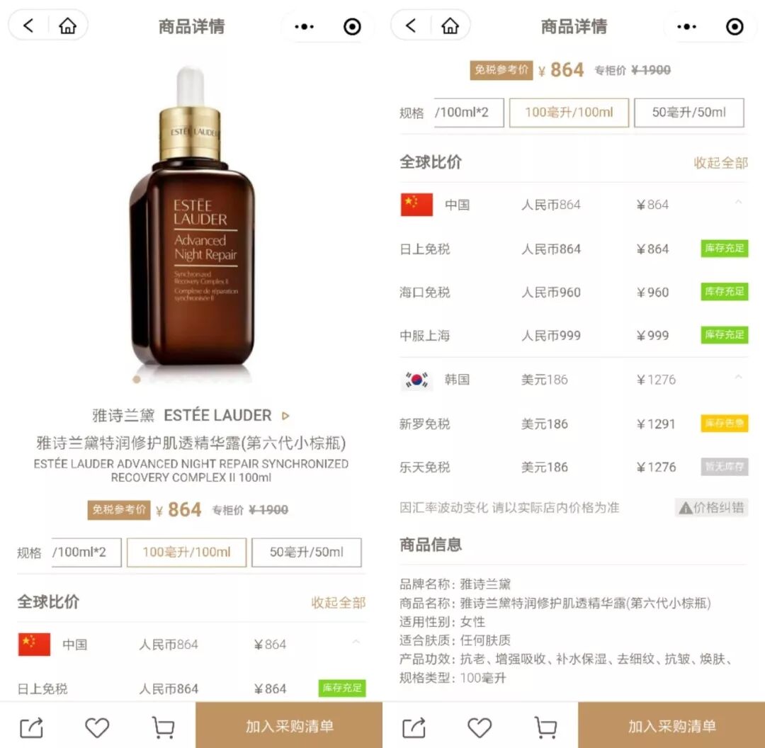 点击进入任一商品,用户可以查询商品日上免税价格,是否有库存等信息。同时,还能和其它免税店比价,包括国内的海口免税、中服上海,韩国的新罗免税和乐天免税等,方便用户决定在何处购买,降低决策成本。