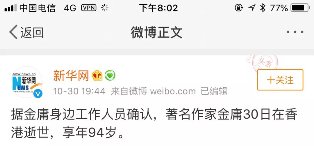 过去几年,金庸先生已经“被去世”几次了。这次又是港台小报传出。最初的半小时,没人敢相信这一切,大家忙着确认消息真实性。直到微博热搜榜上 #金庸去世# 变成“爆”。直到@新华网 发布微博,说金庸身边工作人员已经确认了。