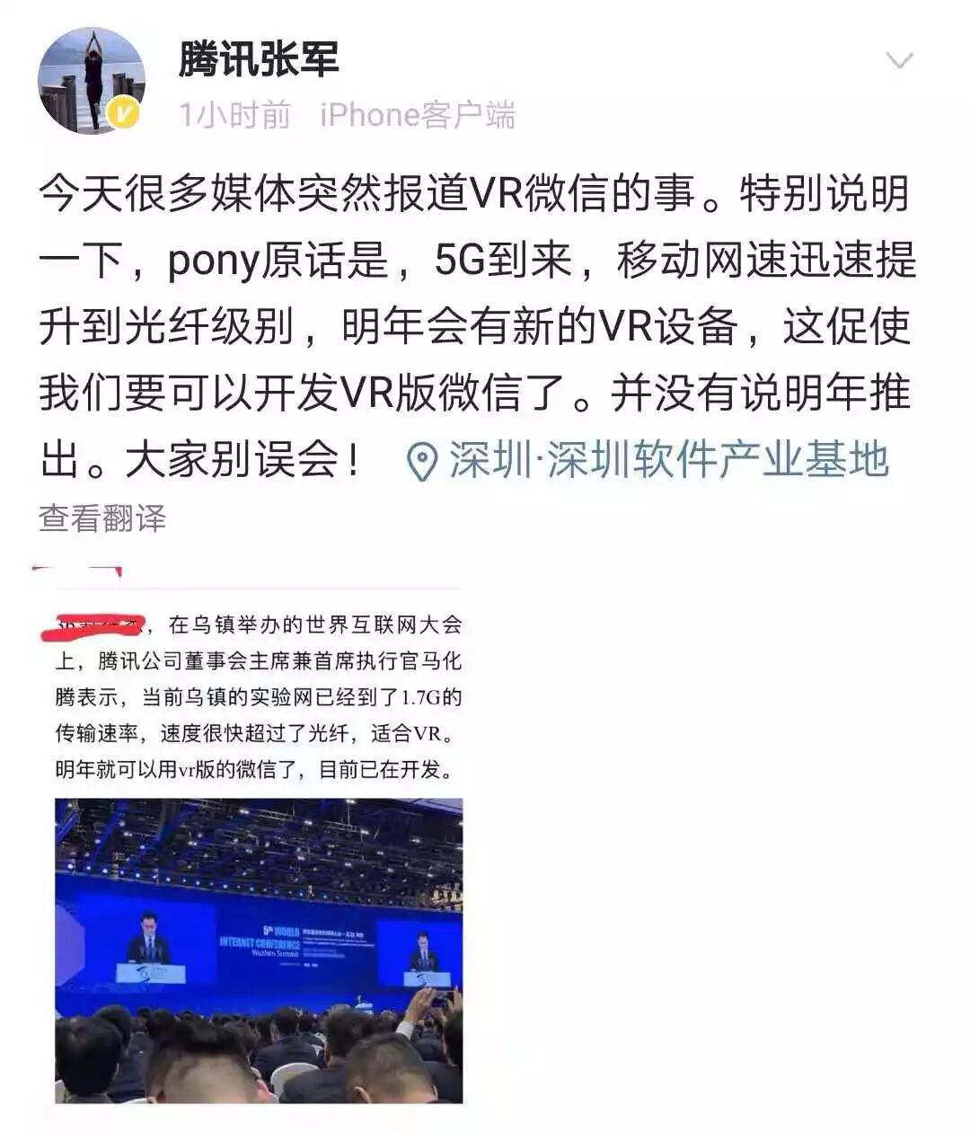 据新浪科技 针对“VR版微信明年推出”的报道,腾讯公关总监张军在今日中午时分发布微博澄清,“pony原话是,5G到来,移动网速迅速提升到光纤级别,明年会有新的VR设备,这促使我们要可以开发VR版微信了。并没有说明年推出。大家别误会!”