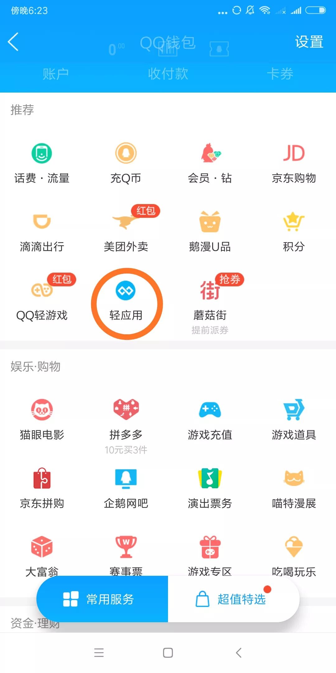 目前QQ并未给轻应用一级入口,需要用户点进QQ钱包中,第一行推荐类目下,轻游戏旁边即可看见轻应用。