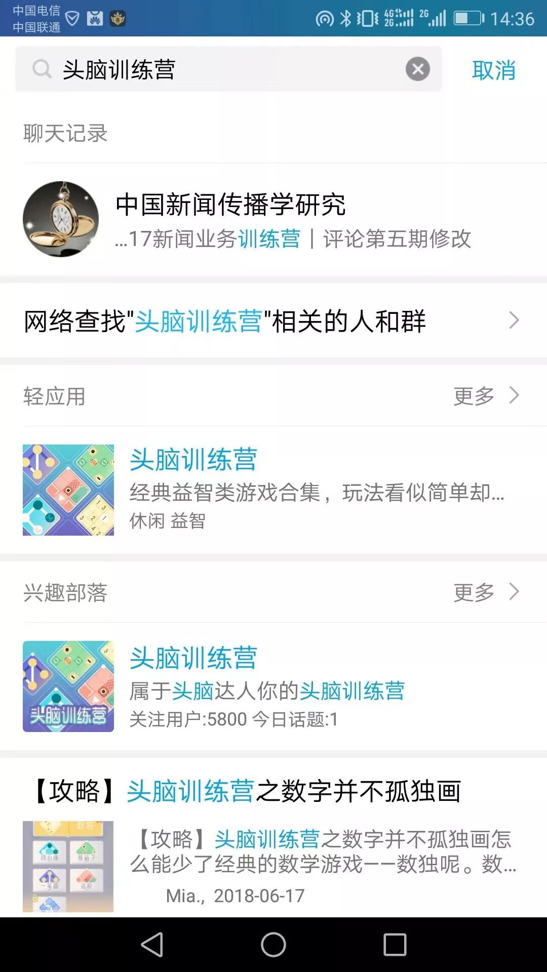 除了QQ钱包这个比较深的入口,QQ还开放了搜索入口。在QQ搜索框中搜索“头脑训练营”,即可显示其轻应用,点击后可直达该轻应用。
