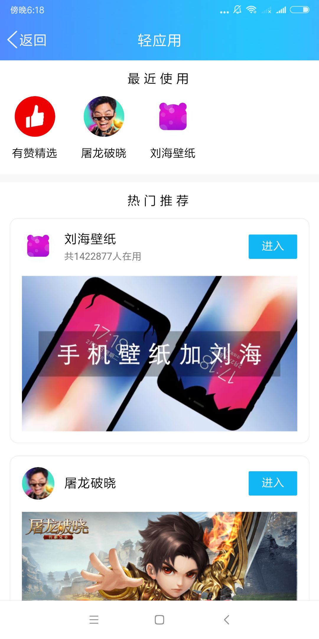 第二大类别是“热门推荐”,这部分和微信较为不同,微信小程序主打去中心化,并没有一个官方的小程序分发平台,而QQ则会推荐一些你可能会用到的轻应用,也可能是因为轻应用刚刚上线,需要官方做一些使用上的引导。