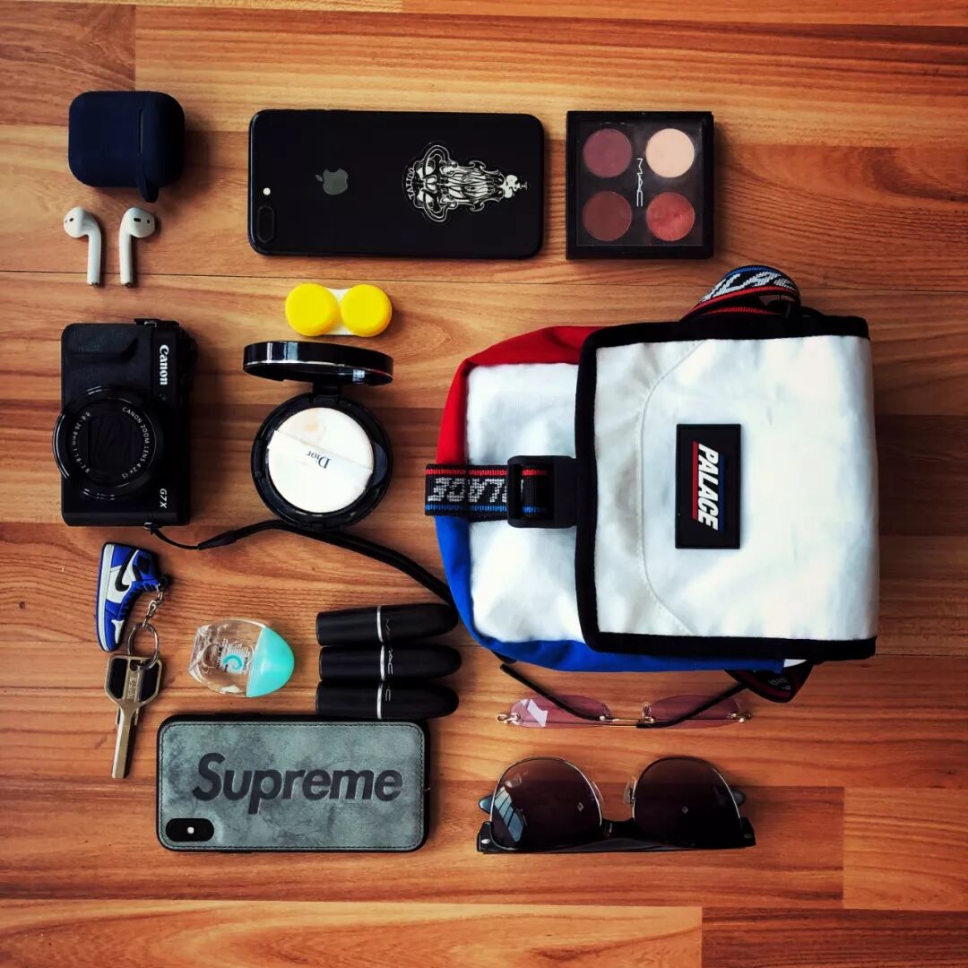 Palace包 带它主要是因为……大!能装的东西多。我不太爱背偏女款的包包,出门不方便,而且我的服装大多是中性风,和那些包包不搭,所以我的包都是偏运动风。