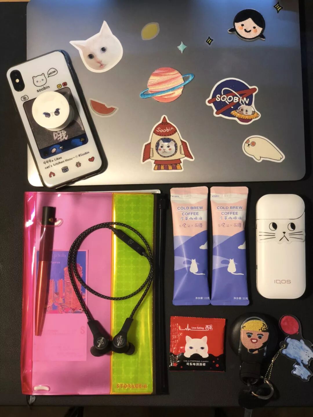 其他像随身必不可少的手机、电子烟我都用上了酥饼大人的周边。这只手机壳可以随心所欲更换喜欢的照片,手机壳上贴的气囊支架可以作为支架和自拍神器使用。