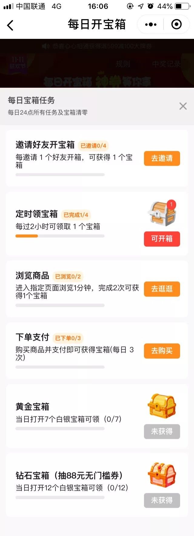 比如拼多多中的宝箱活动,小程序的分享率,打开率,pv,成交量,留存都被安排的明明白白。