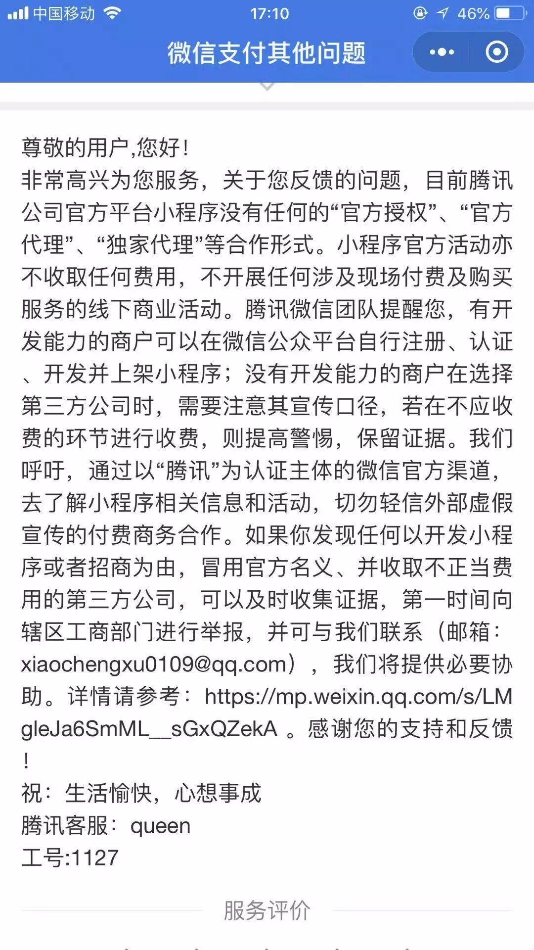 和王小芸一样,张兰也在事后向腾讯官方求证。腾讯客服回复消息表示,腾讯公司官方平台小程序没有任何的“官方授权”、“官方代理”、“独家代理”等合作形式。小程序官方活动亦不开展任何涉及现场付费及购买服务的线下商业活动。