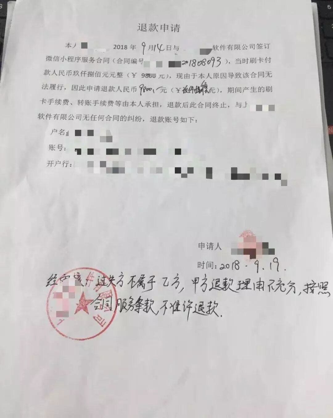 去催问,原来的退款申请书上多了一行字:“经审核,过失方不属于乙方,甲方退款理由不充分,按照合同服务条款,不准许退款。”