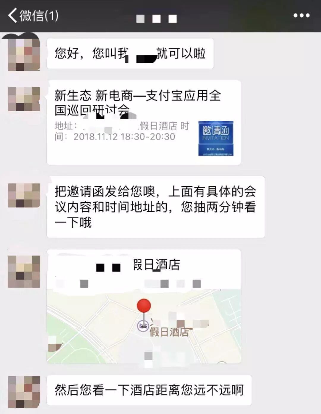 2018年9月9日下午,是个周末,王小芸接到电话,对方自称是支付宝方面的人。作为中小企业主当中被遴选者,王小芸受邀参加所谓的“支付宝应用方面”会议。