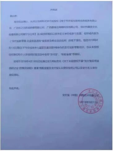 同在今年夏天,蚂蚁金服和支付宝对广东第六感文化传播有限公司提起诉讼,原因是该公司在未经官方授权的情况下,以官方名义召开“支付宝应用公测全国巡回研讨会”等线下活动并收取高额费用,给参会商家造成巨大损失,也破坏了蚂蚁金服、支付宝的品牌形象和开放生态。