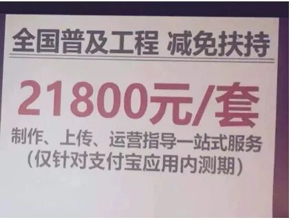 “全国普及工程 减免扶持 21800元/套”,在现场讲演的PPT最后,赫然出现的大字下面,还有两行小字:制作、上传、运营指导一站式服务(仅针对支付宝应用内测期)。