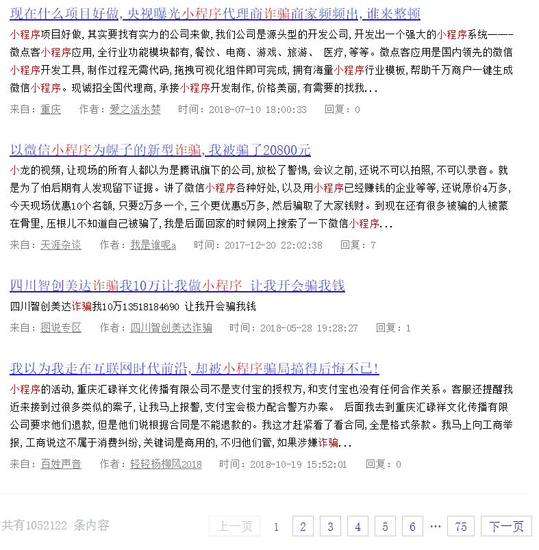 在天涯论坛,以“小程序诈骗”为关键词搜索目前显示“共有1052122条内容”。