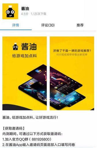 新榜讯 近日,腾讯一款短视频产品“酱油”正在内测,用户需获得邀请码才能体验该应用。据了解,“酱油”是一个游戏垂直社区,会为用户多角度衡量游戏应用,然后以短视频方式进行分发推荐。