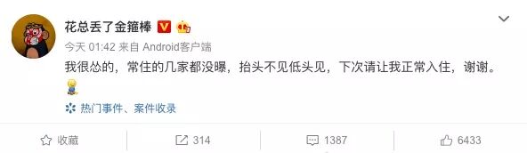 花总发布视频当晚,包括@人民日报 @财经网 @中国新闻周刊 在内诸多媒体第一时间跟进。新浪财经联系了部分涉事酒店,除福州香格里拉大酒店工作人员表示“正在查,后续公关部会尽快给出回应”外,大多数酒店员工都表示,公关部已经下班,明天由公关部做出回复。