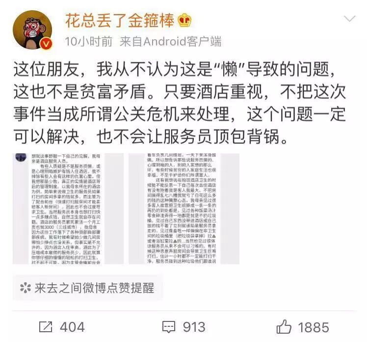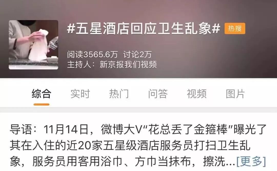 昨晚,微博大V@花总丢了金箍棒 曝光了十余家五星级酒店的卫生乱象,迅速引发热议。