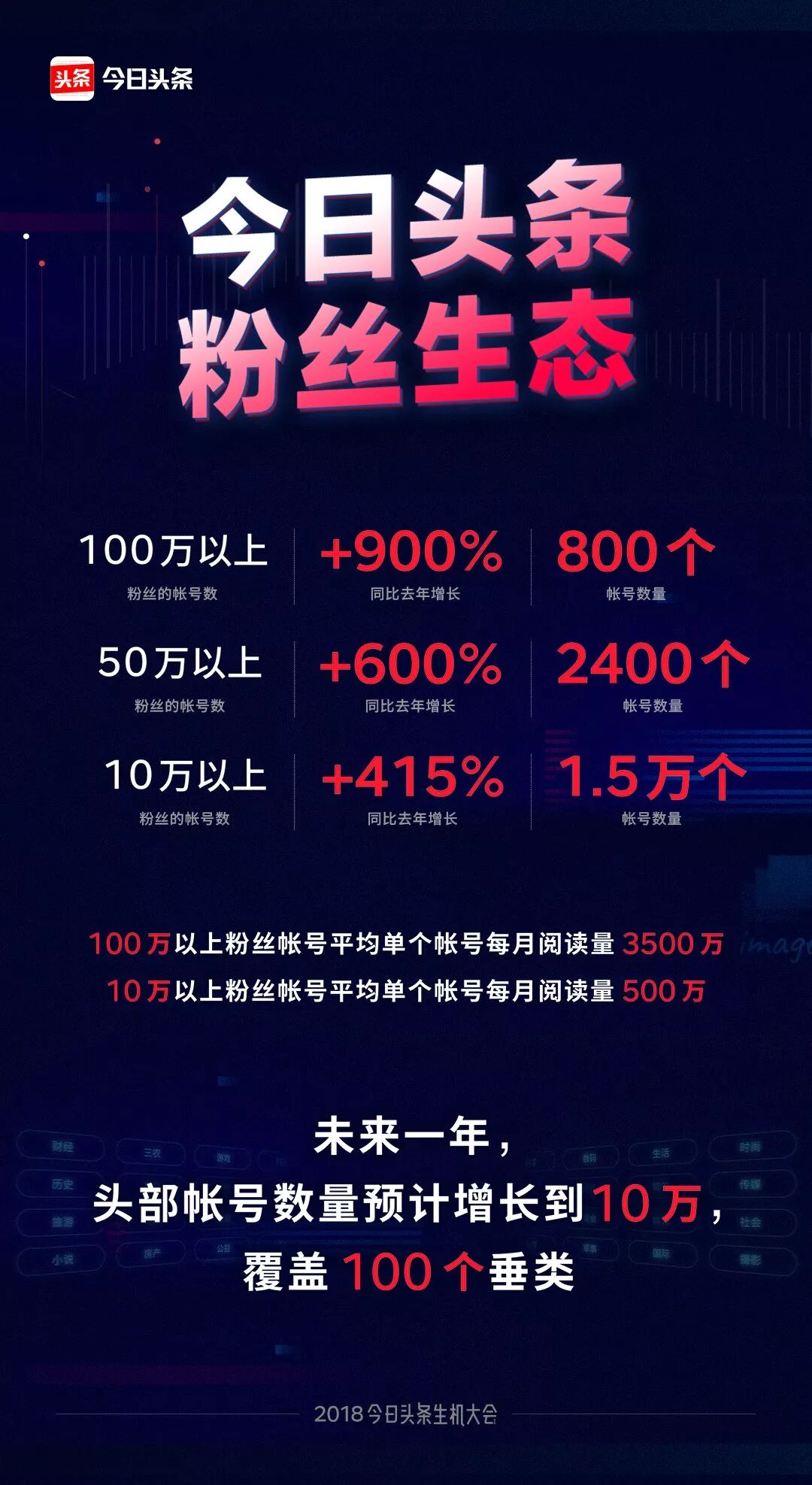 对此,今日头条的答案还是“垂直化”。未来一年,今日头条要在100个垂直领域内深耕,帮助更多垂类优质作者成长起来,帮助他们涨粉,提高影响力,赢得下半场竞争。