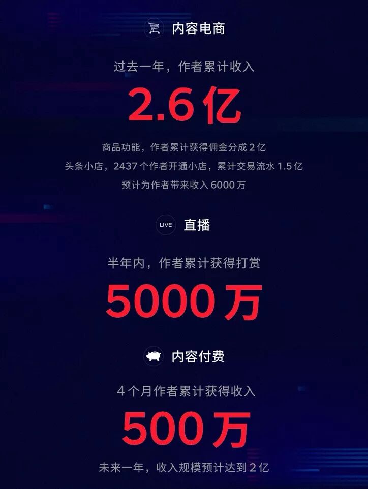 最关键的变现部分,今日头条给出了三个数字:2.6亿、5000万和500万。它们分别对应内容电商、直播、内容付费三种模式。