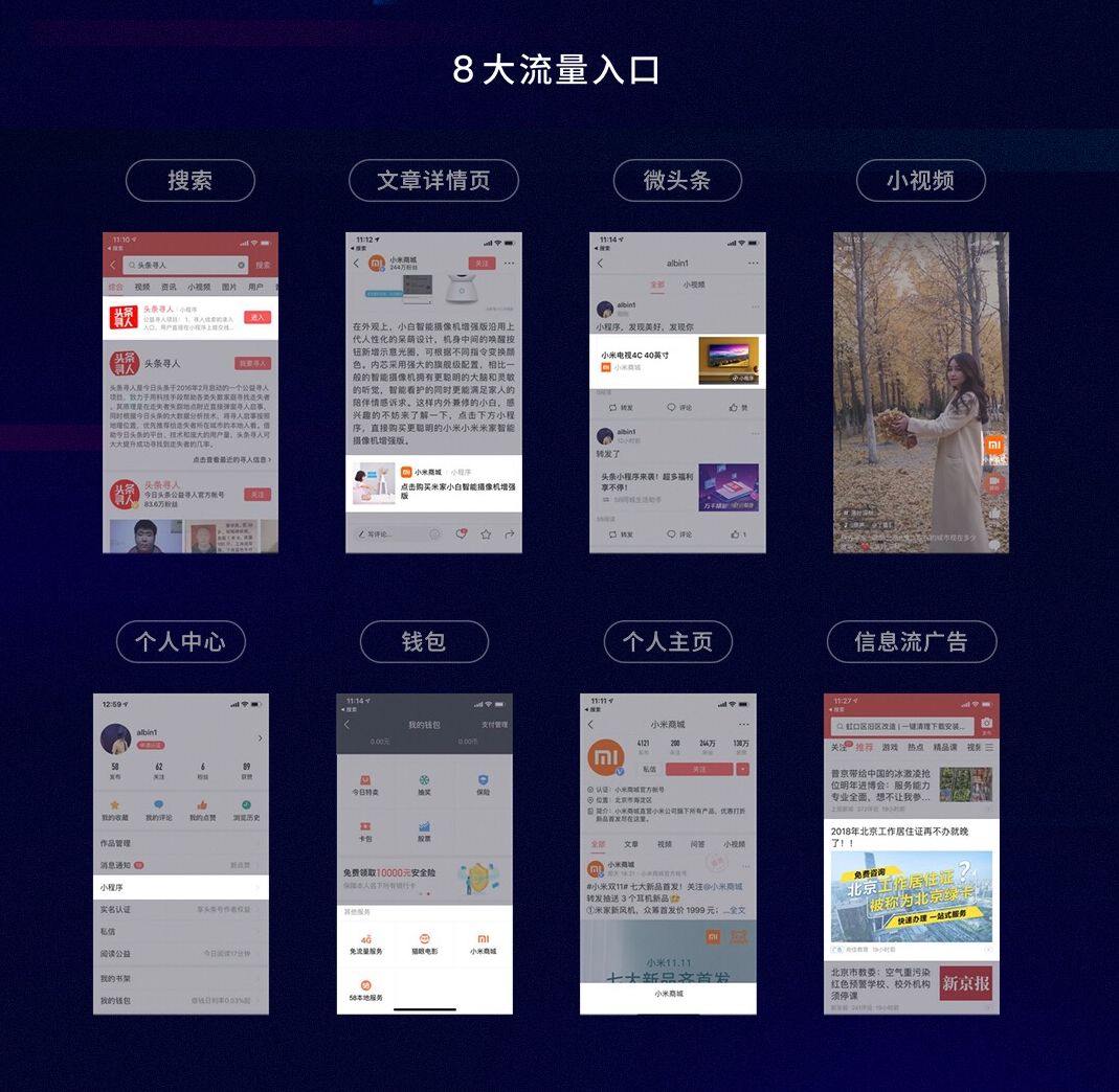 今日头条小程序初次亮相。头条小程序提供8个流量入口,包括文章详情页、微头条、小视频、搜索、账号主页、个人中心、钱包和信息流广告位等。它同样可以在今日头条旗下多个平台中运行,提升创作者内容的服务能力,增加变现。预计明年上半年开发给所有创作者和开发者。
