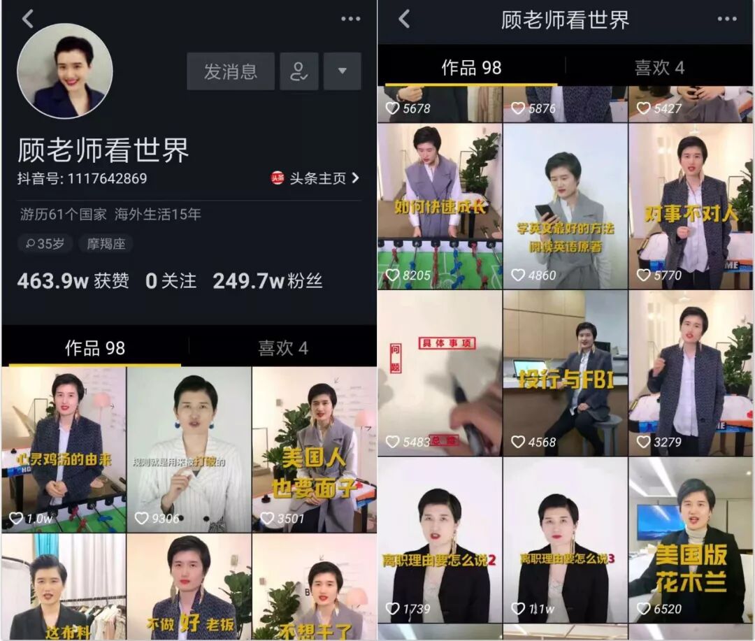 以@聂小雨 为例,公司先对抖音上的音乐账号归类,分析头部数据并寻找差异化。然后才确定了“怀旧老歌+MV画质”的路线。至于@顾及看世界 ,则是先确定“外国”、“职场”的标签,选定相关达人。第一阶段以“外国文化差异”为主,第二阶段细分到“职场精英”,第三阶段可能又要换新方向。