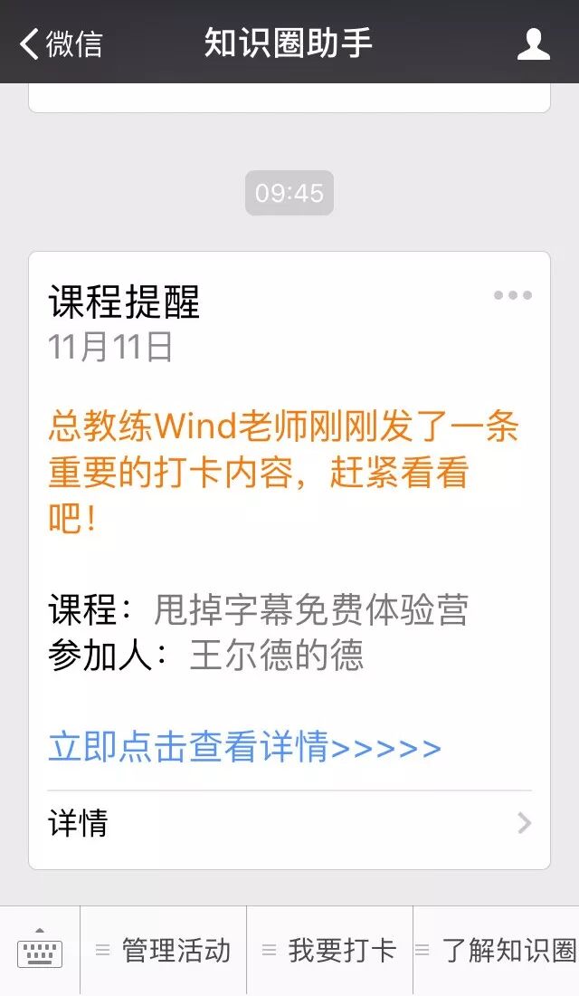 为了提高完课率,「知识圈」还会使用公众号的模板消息推送课程信息,每天提醒用户打卡上课。