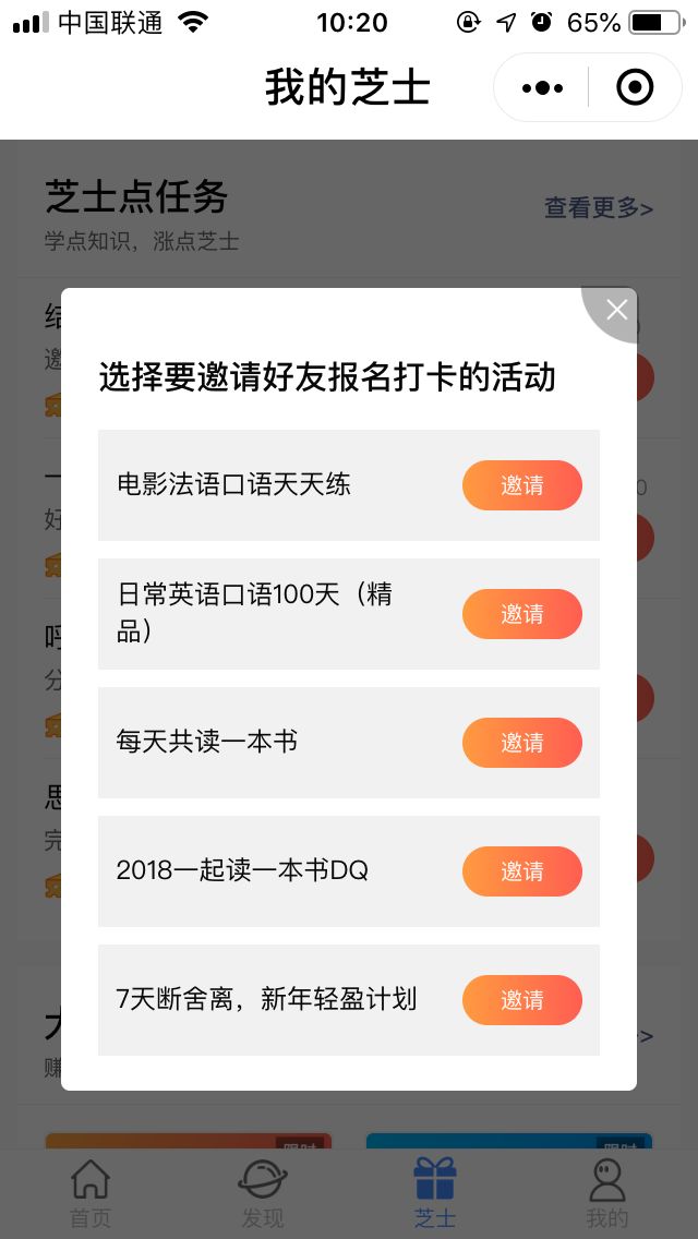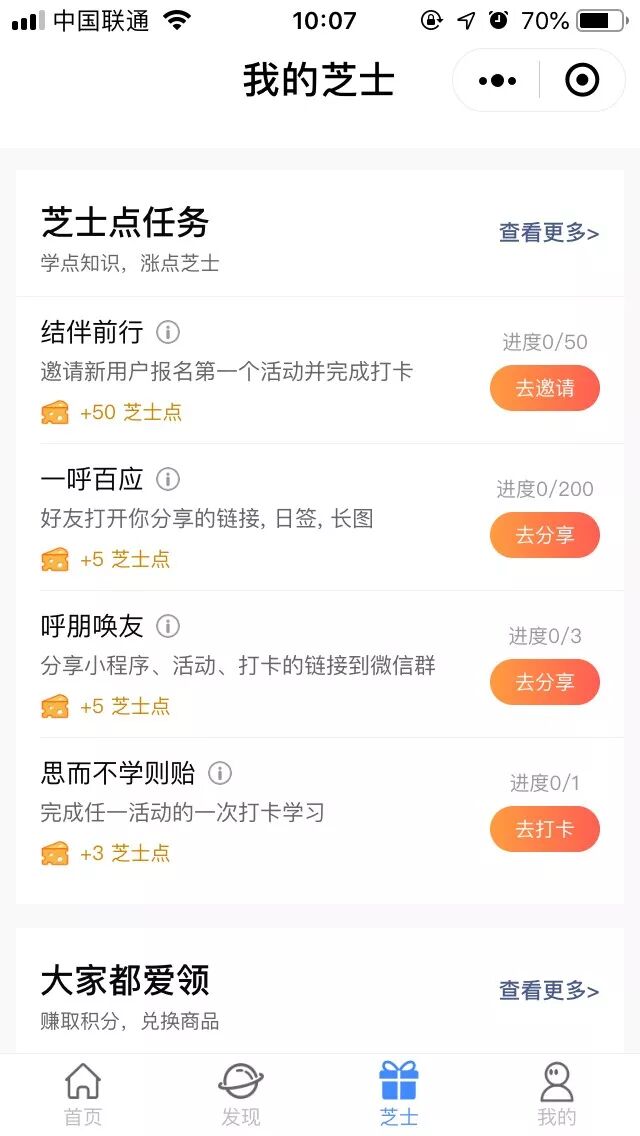 「知识圈」最近还上线了“芝士商城”,用户可以通过做任务来帮助平台推广课程。用户分享课程一定次数后,平台会给一些奖励,这样可以将拉新产品化。类似于趣头条,你每帮我拉一个新用户,你就可以拿到一定积分,积分可以换礼品。