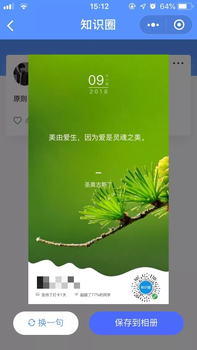 完课后,「知识圈」也提供了日签,朋友圈长图等传播机制,这样的分享可以提高用户荣誉感,也有利于利用微信的社交关系链,召唤更多潜在的同类用户。