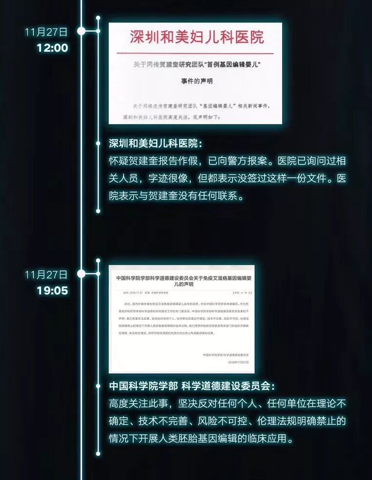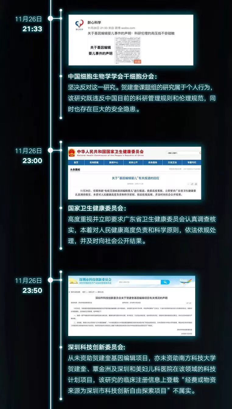 事件发生当天,新华网晚间推文《“基因编辑婴儿”事件刷屏,官方回应来了!》,公布深圳卫计委、南方科技大学的公告和声明:深圳卫计委和深圳和美妇儿科医院的答复,称已启动调查。