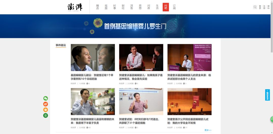澎湃新闻在官方网站开设“首例基因编辑婴儿罗生门”专题,下设“事件疑云”、“伦理争议”、“利益相关方”三个版块,为读者提供了更全面的解读视角。