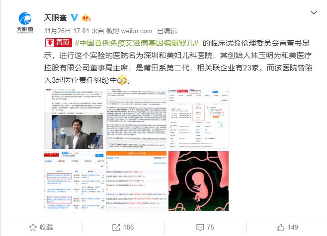 除此外,企业新媒体「天眼查」在事件当天公布了涉事医院的企业资本信息,今日再次公布贺建奎名下企业资本情况。新媒体时代,每个个体都有能力拨开“基因编辑”事件的迷雾。