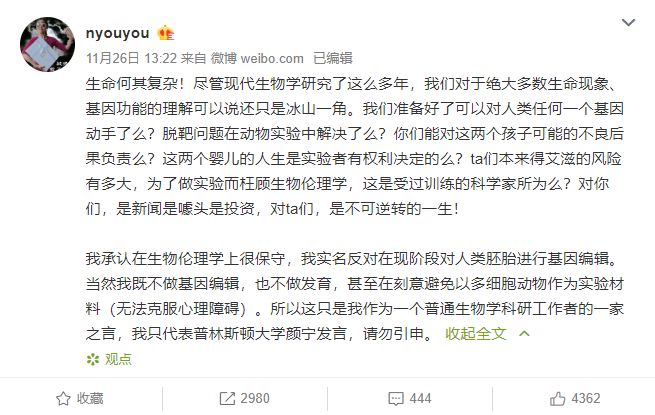 这是“基因编辑”事件中,在社交媒体上获得广泛传播的学者声音,为大众提供了另一层专业解读,帮助大家在阅读后续报道时,贮备一定的学科知识。