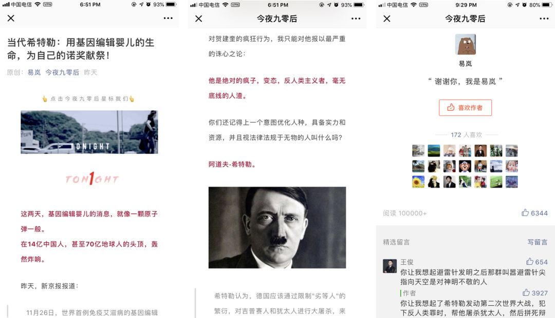 曾写出《崔永元》和《锦鲤大王》爆文的「今夜九零后」26日晚发文《当代希特勒:用基因编辑婴儿的生命,为自己的诺奖献祭!》,整合人民日报、央视新闻、新京报、界面、知乎等多家媒体和论坛的信息和观点,将贺建奎比作希特勒,称: