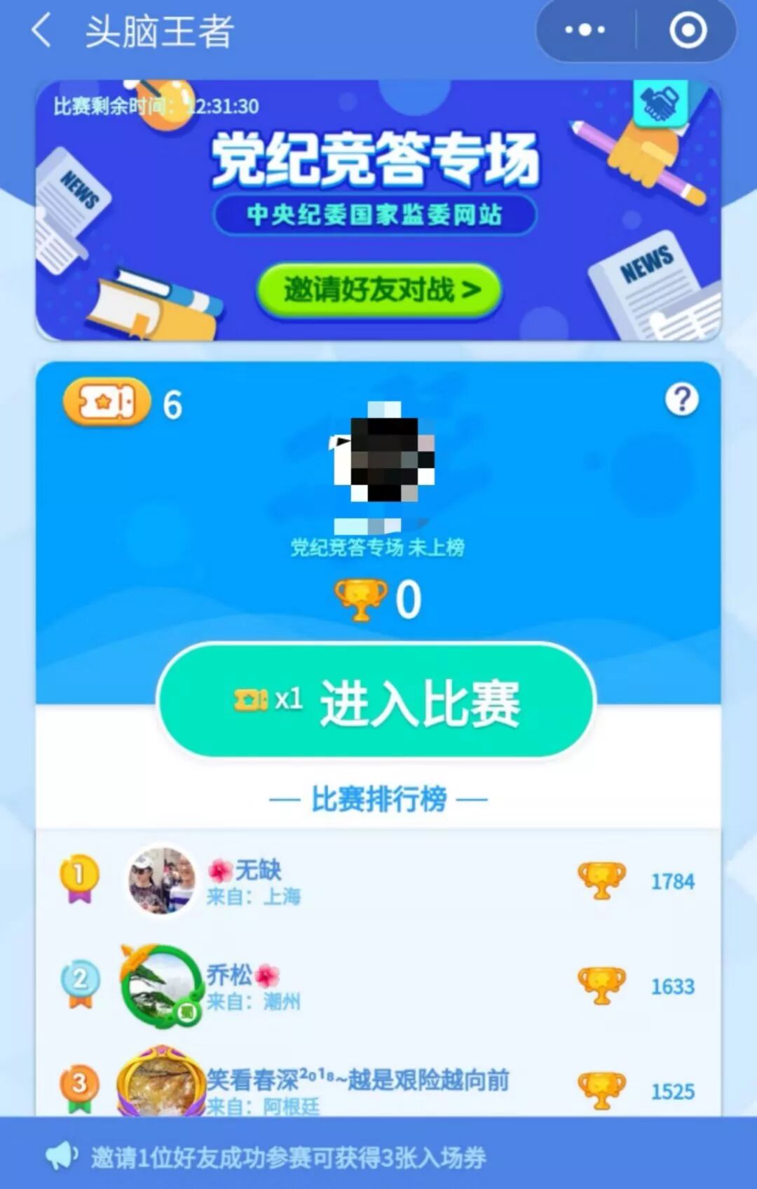 新榜讯 近日,中央纪委国家监委网站联合「头脑王者」小程序上线推出“党纪竞答专场”,该专场以《中国共产党纪律处分条例》为主要考察内容。 更多资讯,敬请关注公众号“量子程序”(ID:vhd999) 中华田园犬 有车以后 小程序骗局 日食记 转转 群接龙 兴趣星球 出境电商 面相研究院 法考王者 知识圈 小影 我是谜 开小课 群勾搭