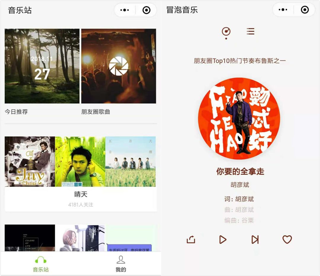 第一种的典型场景是微信,比如「音乐站」、「冒泡音乐」等小程序。「音乐站」的两个核心功能,一是直接展示朋友圈分享过的音乐list,二是可以发送场景标签给朋友,让他们给自己推荐音乐。它就像朋友圈音乐功能的剥离,更加私密和场景化。