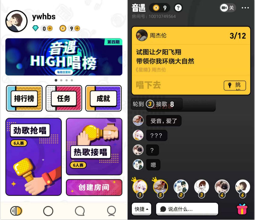 简单说来,「音遇」的玩法是「组团接唱」,系统给出上半段歌词,玩家接出下半段,AI识别是否成功。目前游戏模式有「按序」和「抢答」两种,歌曲场次既有周杰伦,也有抖音专场。这并非线下K歌的挪移,轮流发言的玩法,更像线上「狼人杀」。