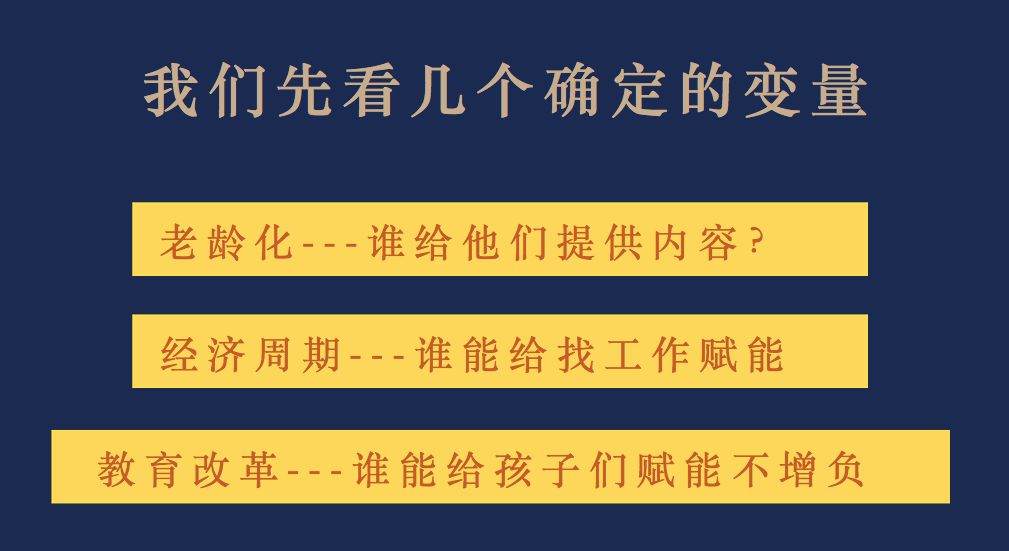 这中间巨大的刚需谁可以填呢?做教育内容的人可以填。这就是我为什么在这个时点上去少年得到当董事长,因为我看见了这个巨大的刚需,提供的人非常少,这就是在确定的变量里找到你的机会。