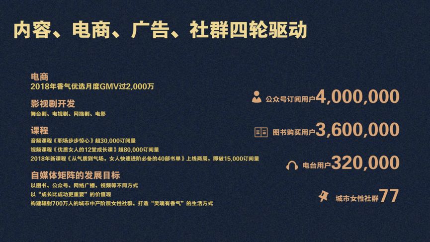 和大型平台不同,我们每个布局的数字拎出来单独看一点都不惊人,还有点少,挺不好意思的。比如说,我们主要公众号的订阅用户也就是400万,图书购买用户也就是360万,还有不到40万广播用户和14万内容付费用户,几项加在一起都不到1000万,但是整个中国的中产女性这个阶层总共有多少人呢?不超过5000万。