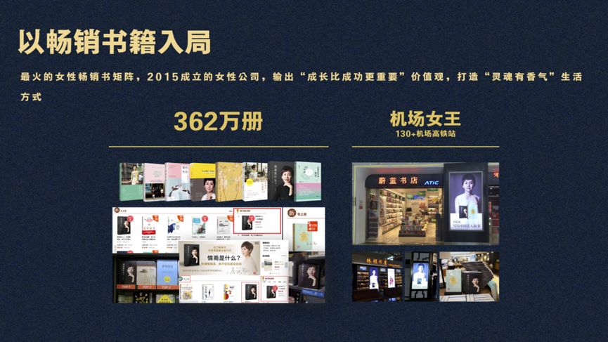 也正是因为这个原因,大家能在很多图书渠道看到我们的书,比如机场、高铁站,这部分特殊渠道精准覆盖了我们的目标消费群体,所以,我们有个外号叫“机场女王”。