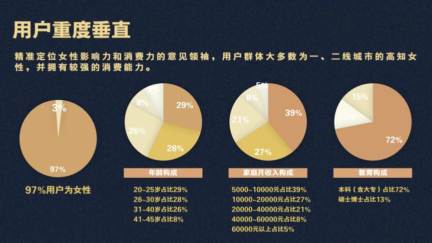 目前,我们的用户97%是女性,比一年半之前的88%更加聚焦,以26-40岁之间的女性为主。