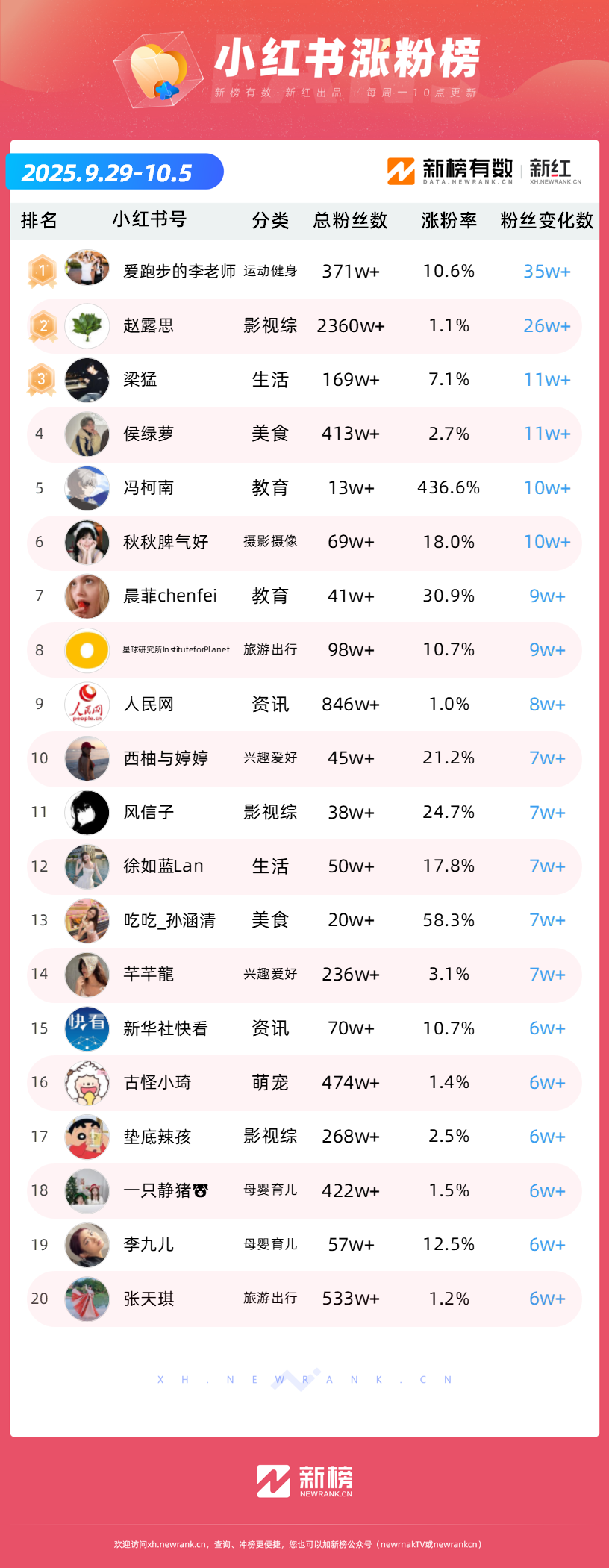 依托新榜旗下小红书数据工具“新红”,新榜推出「小红书涨粉榜」,本次统计周期为2025年9月29日到2025年10月5日。