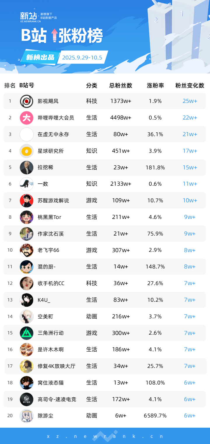 依托新榜旗下B站数据工具“新站”,新榜推出「B站涨粉榜」,本次统计周期为2025年9月29日到2025年10月5日。
