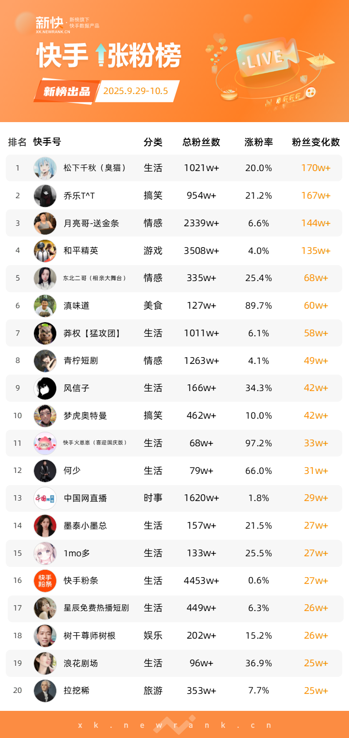 依托新榜旗下快手数据工具“新快”,新榜推出「快手涨粉榜」,本次统计周期为2025年9月29日到2025年10月5日。