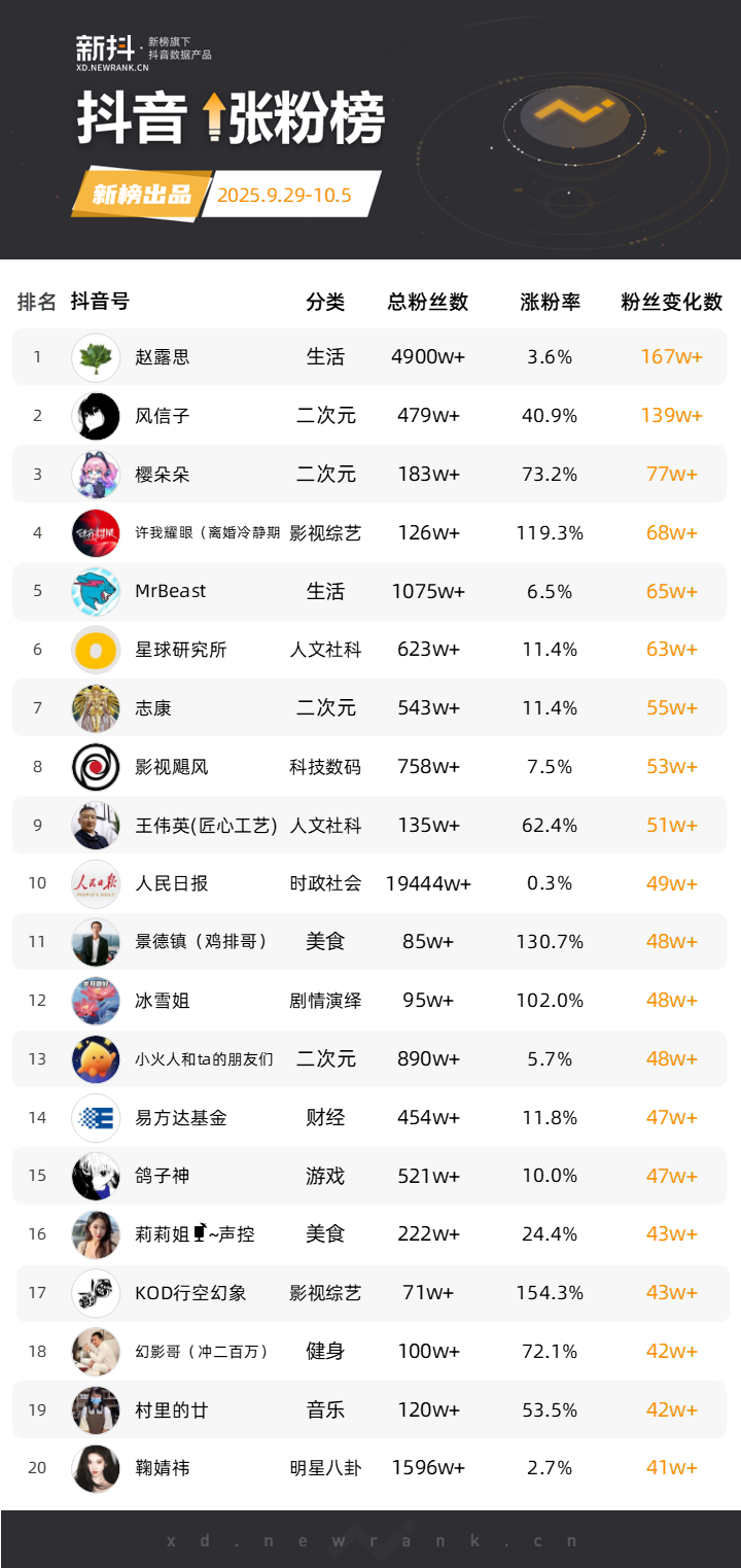依托新榜旗下抖音数据工具“新抖”,新榜推出「抖音涨粉榜」,每周一期。本次统计周期为2025年9月29日到2025年10月5日。