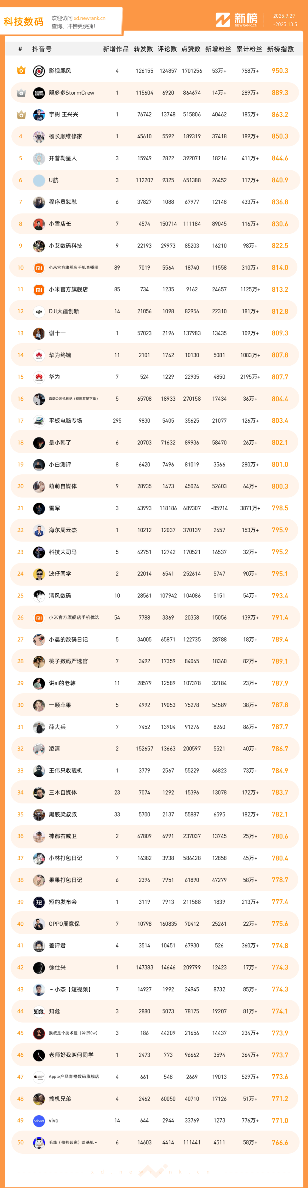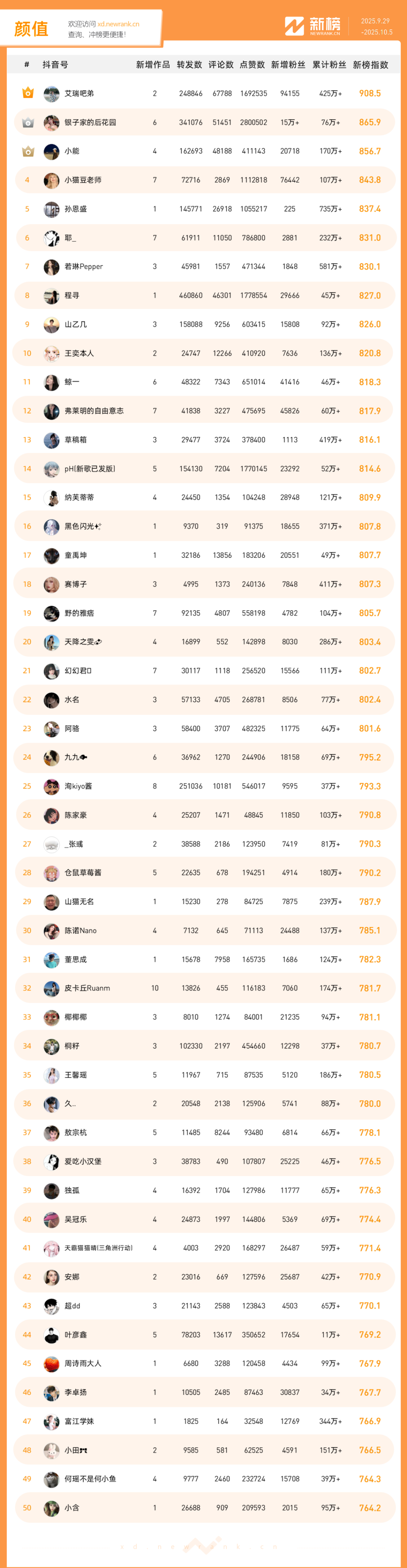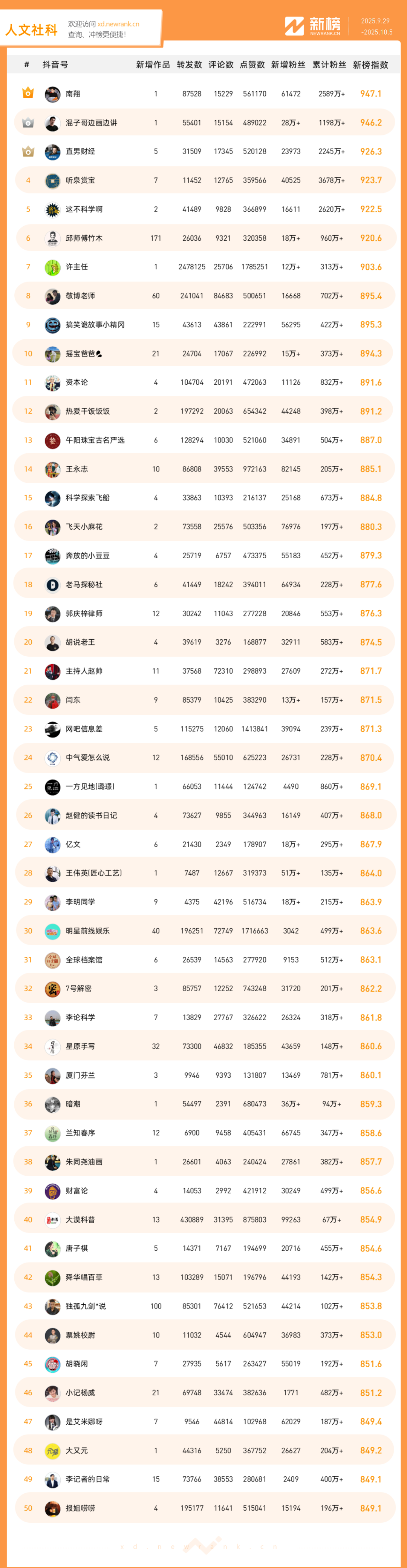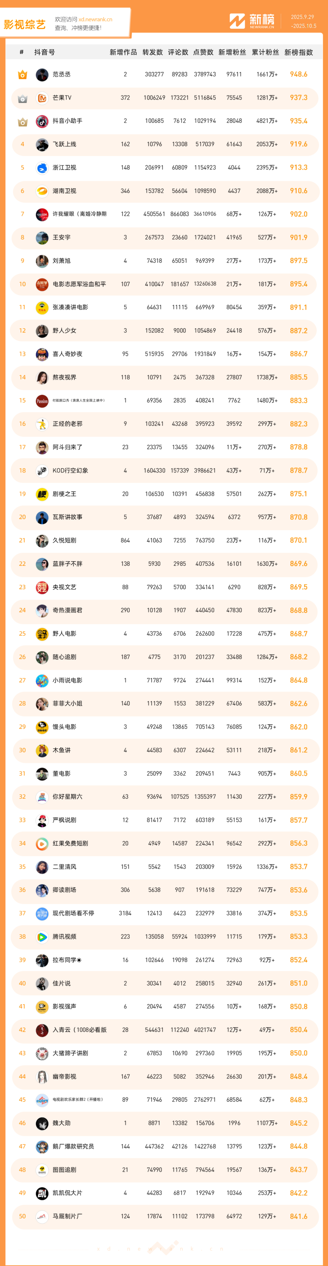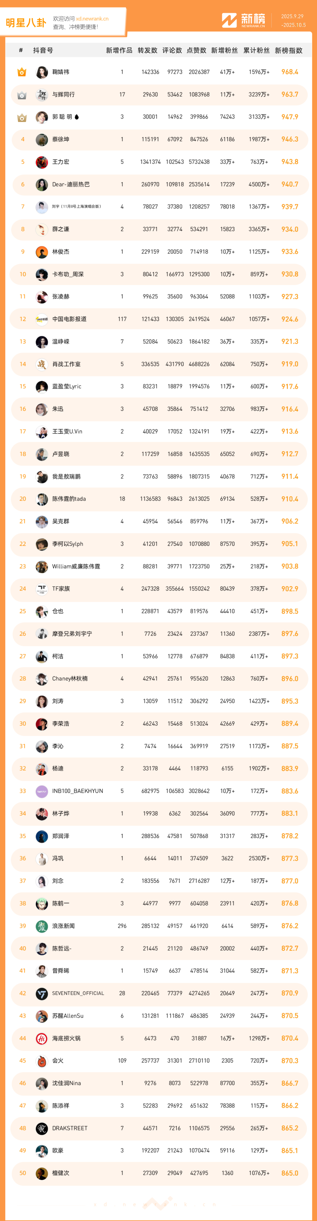 「抖音影响力排行榜」由新榜独家发布,每周一期,本期统计周期为2025年9月29日-2025年10月5日。
