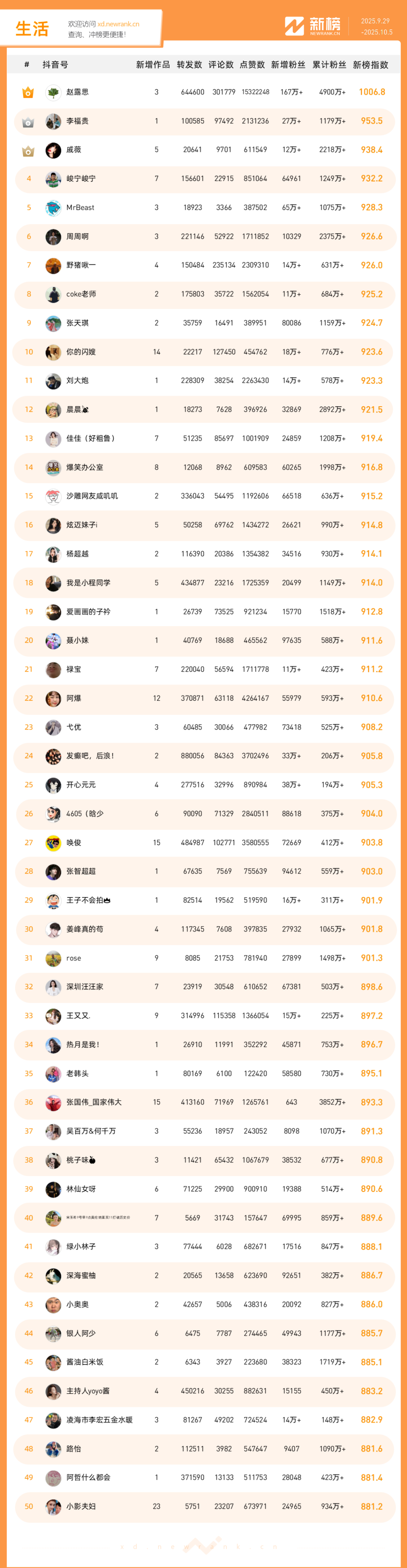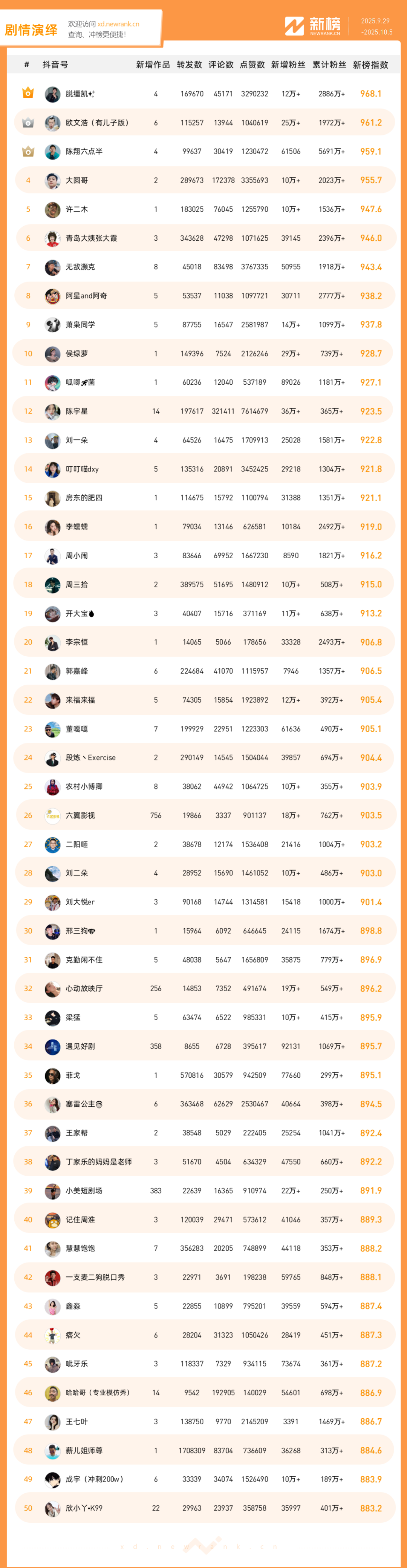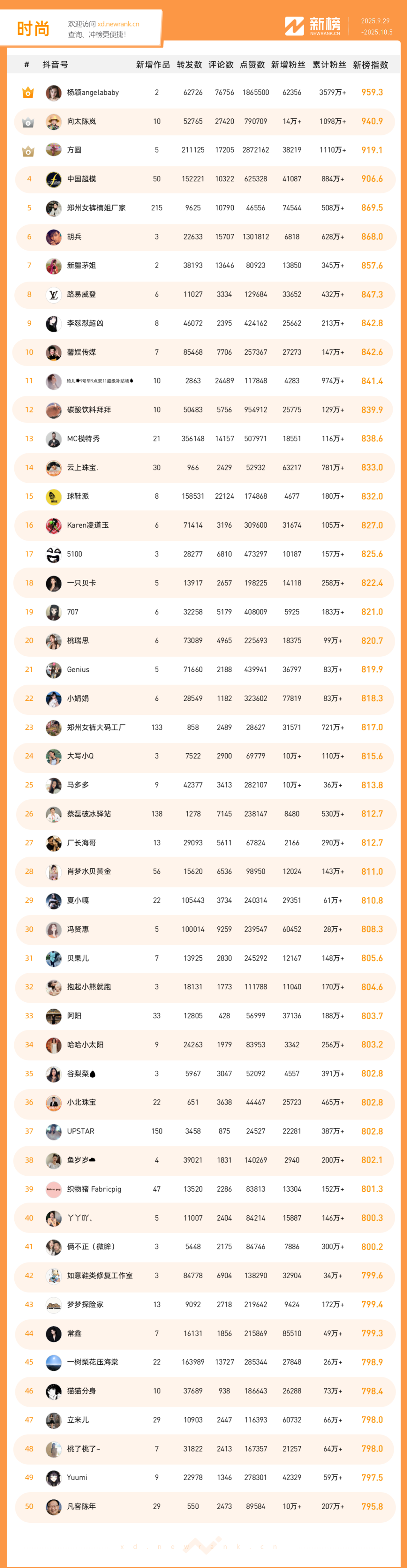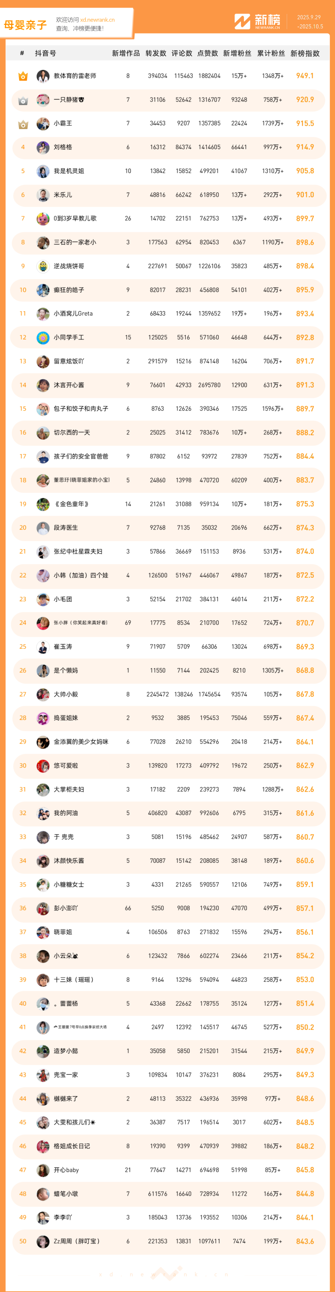 「抖音影响力排行榜」由新榜独家发布,每周一期,本期统计周期为2025年9月29日-2025年10月5日。