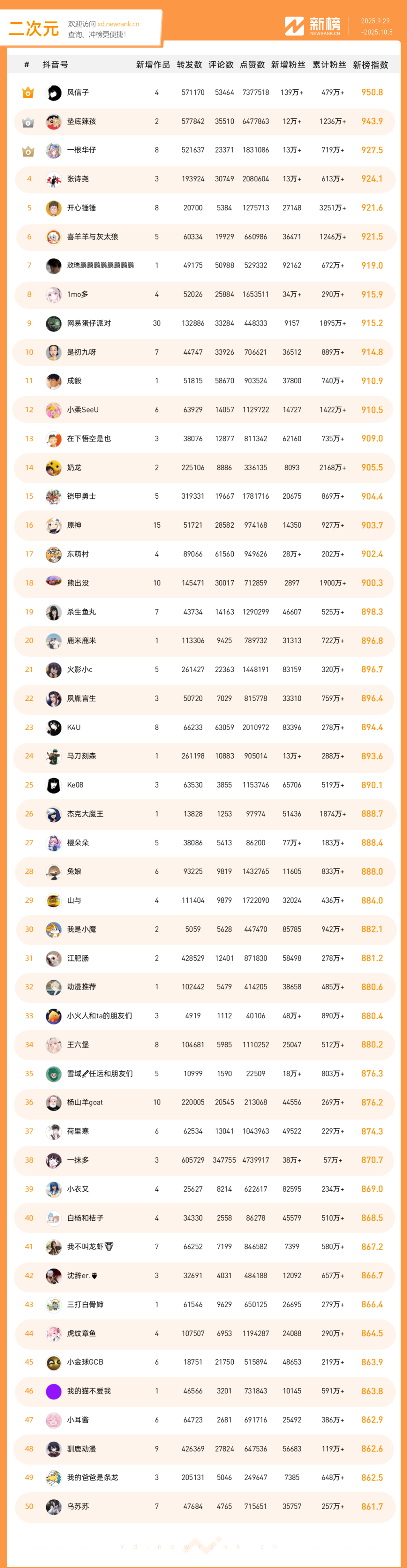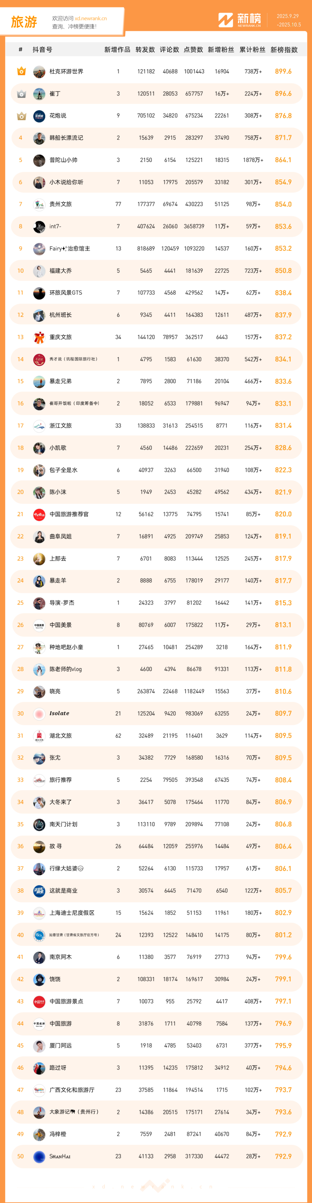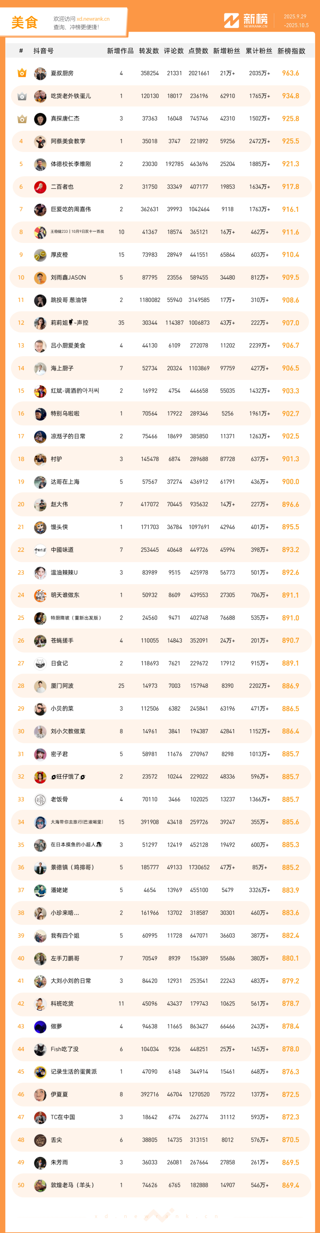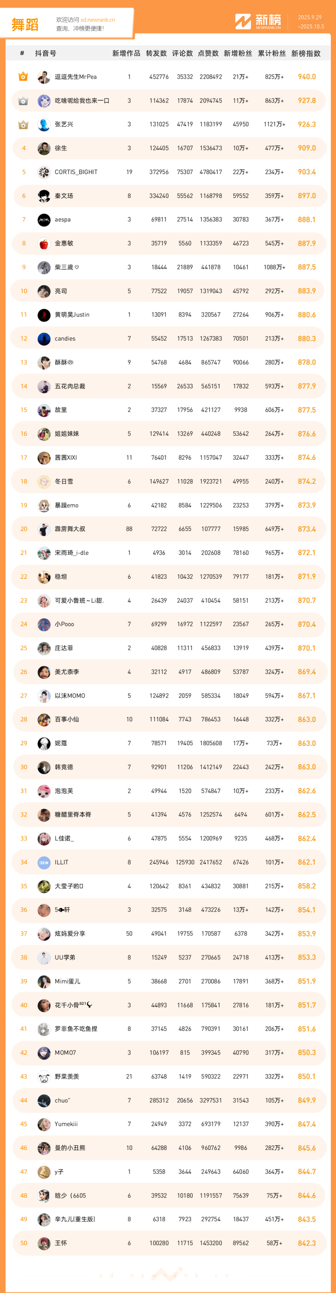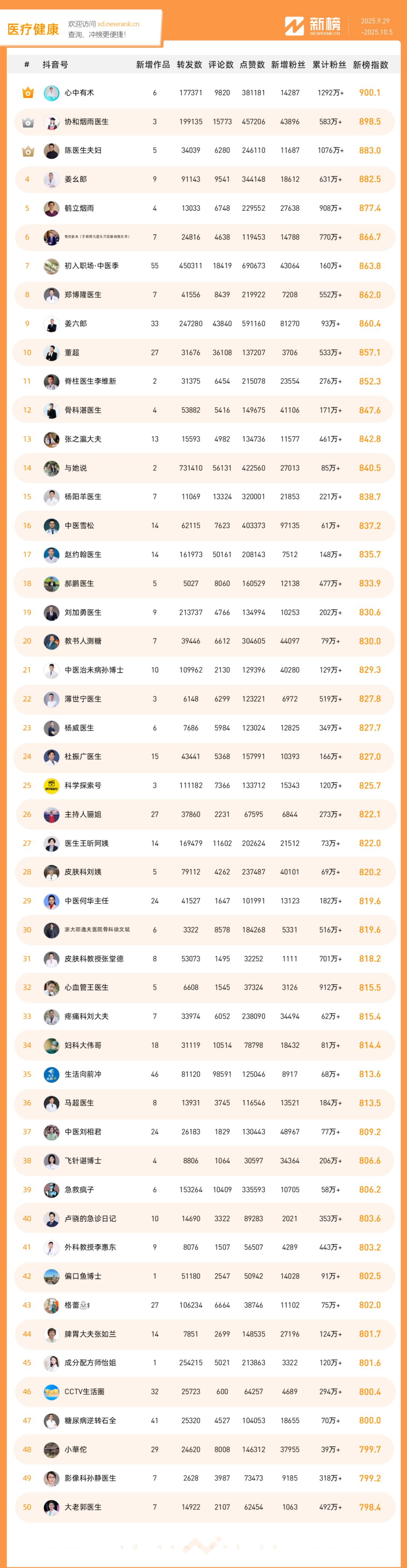 「抖音影响力排行榜」由新榜独家发布,每周一期,本期统计周期为2025年9月29日-2025年10月5日。